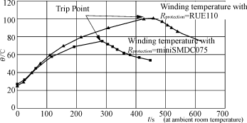 選擇PPTC元件時,需要考慮可以通過的最大負荷電流,最高的環境溫度(通常為45℃)以及由變壓器溫度上升速率所決定的的最大動作時間。