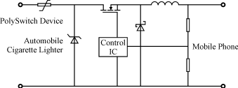 圖3顯示一個典型的CLA電路圖。圖3中是一個PolySwich自複元件和一個瞬時限壓(TVS)二極管提供輸入保護。IC用於控製DC/DC降壓轉換器,由PPTC獨用或與TVS相結合的保護措施可以防止以下4種故障造成的損壞。