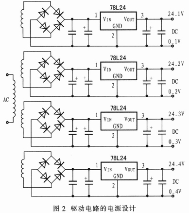 驅動電路需要4路相互隔離的直流電源為4路IGBT驅動電路供電,用220V/22V變壓器對4路交流電源分別整流,用電容器和78L24型電壓調整器穩壓後輸出4路24V直流電壓,如圖2所示。
