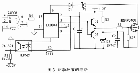 EXB841的6引腳連接的二極管可檢測IGBT的飽和壓降,用來完成過流保護功能,4引腳的過流保護信號延時10μs輸出。當IGBT有過流時,若UCE大於7.5V,內部過流保護電路開始動作,軟關斷IG-BT。通常在IGBT通過額定電流時UCE為3.5V,當UCE=7.5V時,IGBT有過流,其值約為額定電流的3~5倍,但是由於沒有達到保護的閾值,保護電路不起作用。如果長時間工作在這種狀態,則會導致IGBT損壞。為了可靠地保護IGBT,應該降低過流保護閾值,可以在D1與IGBT的集電極間反串一個穩壓管,或多串幾個與D1同規格的快速恢複二極管。如圖3通過反串一個IN4728型3.3V穩壓管使保護閾值降為4.2V。當檢測到IGBT過流後,5引腳變為低電平,TPL521型光耦輸出低電平,通過與門封鎖控製信號輸入,同時使4輸入與非門輸出低電平,觸發功率驅動保護中斷,完成相應的保護處理。