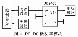 控製電路為弱電部分,極易受到幹擾;驅動電路直接與外電路連接,是一個較強的幹擾源;為wei了le實shi現xian整zheng個ge設she備bei的de電dian磁ci兼jian容rong,控kong製zhi電dian路lu部bu分fen必bi須xu與yu驅qu動dong部bu分fen隔ge離li。為wei了le避bi免mian公gong共gong電dian源yuan對dui控kong製zhi電dian路lu產chan生sheng幹gan擾rao,應ying對dui控kong製zhi電dian路lu及ji驅qu動dong電dian路lu分fen別bie供gong電dian,EXB84l的電源電壓為+20V,一般控製電路的供電電壓為5V,因此,可以利用圖4所示的DC-DC微功率模塊進行電源隔離,采用A2405D型微功率模塊實現電源的隔離。