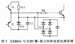 圖5所示為EXB841與IGBT柵-射極之間的連接電路原理圖。當驅動電路中的V4導通時,IGBT處於正常導通狀態,當V5導通時,IGBT柵-射極之間通過穩壓管VZ2提供一個-5V電壓加在其兩端,使IGBT關斷,此時V5處於臨界導通狀態,穩壓管VZ2處於反向偏置狀態。但由於集-柵極之間分布電容的影響,集-柵極之間的du/dt增大時,其通過分布電容形成的電流經過,所以,要克服集-柵極之間的du/dt,確保穩壓管不過壓,避免IGBT誤導通。克服du/dt的方法有二種:一是驅動電路輸出與IGBT柵-射極之間的連線采用雙絞屏蔽電纜,屏蔽層接地,二是采用快速吸收電路吸收過電壓。