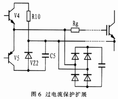 EXB841自身具有過流保護功能,其保護原理是利用IGBT的集電極通態飽和壓降與集電極電流呈近似線性關係。當IGBT工作在正常狀態時,EXB841的6腳電位箝製在8V,內部保護不動作,當IGBT因承受過流而退出飽和狀態時,IGBT集-射極間的電壓上升很多,與EXB84l的6引腳相連的快速二極管截止,EXB841的6引腳被懸空,內部保護動作,輸出驅動電壓慢慢下降,實現IGBT的軟關斷。