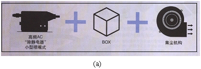 如Creceed除靜電盒產品具有3種功能:除靜電、除塵與集塵。其構成由小型噴嘴式高頻AC“除靜電器”與BOX及集塵機構組成,如圖3(a)所示。
