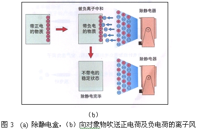 除靜電器是一種通過向對象物吹送正電荷及負電荷的離子風來中和對象物帶電狀態的裝置,如圖3(b)所示。