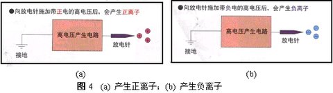 ⑵ 電暈放電是指:2個ge導dao體ti之zhi間jian產chan生sheng局ju部bu高gao電dian壓ya時shi,因yin空kong氣qi絕jue緣yuan遭zao到dao破po壞huai而er產chan生sheng的de伴ban有you藍lan紫zi色se輝hui光guang的de放fang電dian現xian象xiang。電dian暈yun放fang電dian式shi除chu靜jing電dian器qi會hui對dui放fang電dian針zhen施shi加jia高gao電dian壓ya,從cong而er引yin起qi電dian暈yun放fang電dian。由you於yu電dian暈yun放fang電dian的de緣yuan故gu,放fang電dian針zhen附fu近jin的de空kong氣qi發fa生sheng電dian離li,產chan生sheng帶dai電dian離li子zi。圖tu4(a)所示為向放電針施加帶正電的高電壓後產生正離子過程。圖4(b)所示為向放電針施加帶負電的高電壓後,產生負離子過程。