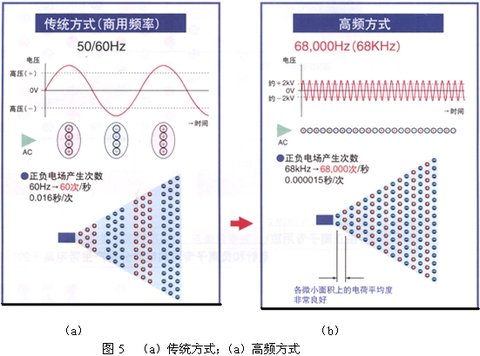 商用頻率的除靜電器產生帶電離子的頻率很低,隻有50/60Hx,因此短時間內的電離平衡較差,帶電離子會在軟管中消失,所以無法利用軟管運送帶電離子,見圖5(a)。從圖中可知,因軟管內帶電離子相互吸引力較強,容易被中和,無法運送帶電離子。而小金井除靜電器的頻率高達68kHz,因此電離平衡良好、且帶電離子在軟管中難以被中和,所以使原本難以實現的“利用軟管運送離子”成為可能,如圖5(b)所示。由圖可知,因軟管內帶電離子相互吸引力較弱,難以被中和,所以利用軟管運送離子”成為可能。