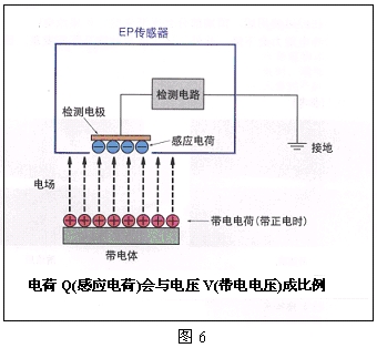 靜電電位傳感器“EP傳感器”主(zhu)要(yao)利(li)用(yong)了(le)帶(dai)電(dian)物(wu)體(ti)和(he)檢(jian)測(ce)電(dian)極(ji)之(zhi)間(jian)的(de)靜(jing)電(dian)感(gan)應(ying)現(xian)象(xiang)。帶(dai)電(dian)物(wu)體(ti)的(de)電(dian)場(chang)會(hui)致(zhi)使(shi)檢(jian)測(ce)電(dian)極(ji)表(biao)麵(mian)產(chan)生(sheng)感(gan)應(ying)電(dian)荷(he)。該(gai)感(gan)應(ying)電(dian)荷(he)會(hui)被(bei)換(huan)算(suan)成(cheng)帶(dai)電(dian)物(wu)體(ti)的(de)電(dian)位(wei)並(bing)顯(xian)示(shi)出(chu)來(lai)。其(qi)基(ji)本(ben)原(yuan)理(li)見(jian)圖(tu)6。電荷Q(感應電荷)與電壓V(帶電電壓)成比例。