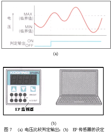 ⑷ 判定輸出功能。一旦超過設定電壓(臨界值),便會通過傳感器LED和電壓比較輸出(判定輸出)發出通知,如圖7(a)所示。
