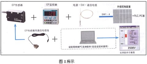 從圖8可知,通過電腦進行設定的EP監視器連接是由外部控製裝置與電腦及其組件構成。而組件必需是EP傳感器1台(如DTY-EPS型)與EP監視器1台(如DTY-EPU)及電源SW•通信電纜線.及EP傳感器用通信電纜線。