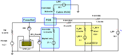 在上圖中,汽車充電係統由交流發電機和鉛酸電池來表示。在這種情況下,要利用Ansoft公司的汽車工具箱之中的Simplorer電化學建模工具對電池進行比較詳細的建模。PowerNet被高度簡化為由線規電阻建模的四個分支電路,包括引擎控製、車箱氣候控製、本地ECU和EPS(最右邊)。PowerNet分配點被標注為PDB或電力分配箱。