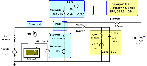 上圖與前一張PowerNet電路圖相同,但是,增加了放置在EPS負載點的超級分布式模塊。這個超級模塊是一個標準的汽車設計產品,它在大的用電負載附近像電池一樣提供穩定和平滑的PowerNet。所有其它地方一樣,存在超級分布式模塊的地方,就可以容易地在PowerNet和ECU電壓上觀察到平滑作用。