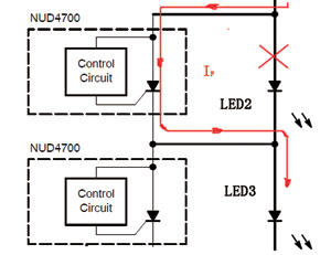 NUD4700的典型應用電路如圖4所示。這是一個交流供電,往AC/DC轉換器輸出直流電壓,再由NUD4701恒流LED驅動器驅動5個串聯的1W大功率LED的電路。NUD4700與LED並聯連接在一起。在LED未開路時,由於LED的正向降壓VF小於晶閘管的“開啟”電壓V(BR),則NUD4700為“關閉狀態”。在關閉狀態時,隻有小於250μA的漏電電流經過NUD4700,相當於NUD4700“開路”,不影響LED的工作。若串聯的LED中有一個(如LED2)因損壞而開路了,此時與LED2並聯的NUD4700的A、C之間電壓超過了“啟動”電壓V(BR)(5.5~7.5V),NUD4700啟動,由關閉狀態轉為“導通狀態”。在導通狀態時,A、C之間導通電壓VT為1.0~1.2V。此時,LED的電流由LED1流經NUD4700的A、C,再流入LED3,如圖5所示。5個LED的燈僅有4個LED工作,其亮度稍差一些,但仍可以正常工作,並且不影響其恒流的大小。