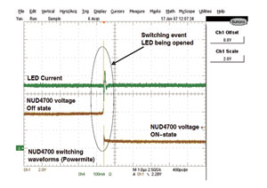 NUD4700的典型工作波形如圖6所示。圖6中,綠色是LED電流波形,棕色是NUD4700關閉狀態轉換到導通狀態的波形。橢圓內是LED開路瞬間波形,此時,LED電流IF經一些波動後恢複到原來電流;與此同時,NUD4700由關閉狀態轉換到導通狀態,其電壓由VF下降到1~1.2V,其響應時間是很快的(dv/dt最小值為250V/μs)。
