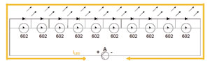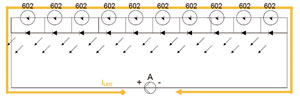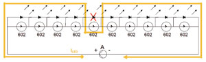 若在串聯的LED中有一個開路,如圖9所示,則與此並聯的SMD602的正、負極之間電壓大於其開啟電壓4.65~5.25V,此器件由關閉狀態轉換為導通狀態,降壓為1~1.2V。LED電流經SMD602內部的晶閘管後流到下一個LED,保證其他未開路的LED正常工作。圖中用紅線X表示此LED開路。