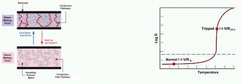 圖2.在過電流或過熱情況下,PPTC元件通過從低阻值狀態轉換為高阻值狀態來保護電路
