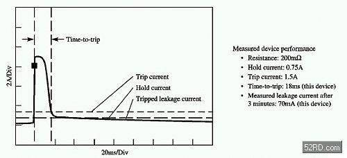 動作時間是PPTC在zai故gu障zhang情qing況kuang下xia對dui動dong作zuo速su度du的de特te性xing所suo進jin行xing之zhi描miao述shu。在zai小xiao功gong率lv應ying用yong條tiao件jian下xia,動dong作zuo時shi間jian是shi關guan鍵jian因yin素su,因yin為wei在zai整zheng個ge係xi統tong的de電dian壓ya降jiang低di或huo減jian弱ruo且qie係xi統tong性xing能neng受shou到dao影ying響xiang之zhi前qian,小xiao型xing電dian源yuan維wei持chi在zai短duan路lu電dian流liu而er不bu受shou損sun的de時shi間jian可ke能neng很hen短duan。動dong作zuo時shi間jian數shu值zhi與yu元yuan件jian的de設she計ji、元件的大小和工作電流性能有很大關係,且還要考慮到電路板設計;即ji電dian路lu板ban上shang較jiao寬kuan的de連lian線xian或huo較jiao大da的de焊han接jie器qi等deng同tong於yu散san熱re器qi,均jun可ke增zeng加jia動dong作zuo時shi間jian。縮suo小xiao焊han接jie器qi的de尺chi寸cun,選xuan擇ze較jiao低di的de工gong作zuo電dian流liu能neng夠gou改gai善shan動dong作zuo時shi間jian性xing能neng。