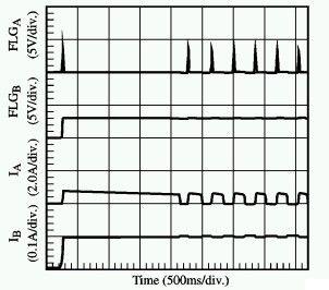 PowerSwitch電源開關元件檢測到了通道A的故障,並開始限製電流。而隻有在通道A,PowerSwitch將真正地開始ON/OFF循環週期直至故障現象消失。而通道B上的連續電流處於技術規範之內,其工作保持不受影響。