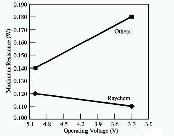 在USB的(de)設(she)計(ji)中(zhong),另(ling)一(yi)項(xiang)重(zhong)要(yao)的(de)考(kao)慮(lv)因(yin)素(su)是(shi)隨(sui)著(zhe)電(dian)壓(ya)的(de)下(xia)降(jiang),電(dian)阻(zu)值(zhi)也(ye)會(hui)下(xia)降(jiang)。隨(sui)著(zhe)供(gong)電(dian)電(dian)壓(ya)的(de)下(xia)降(jiang),電(dian)壓(ya)降(jiang)問(wen)題(ti)顯(xian)得(de)更(geng)加(jia)突(tu)出(chu)。一(yi)般(ban)來(lai)說(shuo),電(dian)壓(ya)下(xia)降(jiang)將(jiang)導(dao)致(zhi)電(dian)源(yuan)開(kai)關(guan)的(de)導(dao)通(tong)電(dian)阻(zu)增(zeng)加(jia),這(zhe)是(shi)一(yi)種(zhong)不(bu)期(qi)望(wang)的(de)特(te)性(xing)。但(dan)Raychem的PowerSwitch元件的電阻卻能夠隨著供電電壓的下降而下降,因而避免這不利特性。如圖7所示,在匯流排電壓較高時,PowerSwitch能夠減少輸出電流值,提升電源的效率和電池的使用壽命。在匯流排電壓較低時,PowerSwitch兩端的電壓降也會降低,這樣USB功能就能繼續工作一段更長的時間。