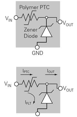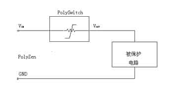 在正常工作時,VIN輸入電壓高於齊納二極管的擊穿電壓VZ,有IFLT電流經齊納二極管到地,VOUT輸出穩定的電壓。有不正常的過壓輸入VIN 時,則齊納二極管的IFLT會產生過流,當器件上有過流時,其電阻由低阻態瞬變到高阻態,使在其上的壓降大增,VOUT輸出基本不變,而流過齊納二極管的 電流IFLT反(fan)而(er)減(jian)小(xiao),如(ru)下(xia)圖(tu)所(suo)示(shi)。器(qi)件(jian)上(shang)電(dian)壓(ya)降(jiang)的(de)增(zeng)大(da)既(ji)保(bao)護(hu)了(le)齊(qi)納(na)二(er)極(ji)管(guan),又(you)保(bao)護(hu)了(le)下(xia)遊(you)的(de)電(dian)路(lu)。另(ling)外(wai),若(ruo)被(bei)保(bao)護(hu)的(de)下(xia)遊(you)電(dian)路(lu)中(zhong)存(cun)在(zai)有(you)局(ju)部(bu)短(duan)路(lu)或(huo)短(duan)路(lu)故(gu)障(zhang) 時,IOUT會增加,PPTC元件由低阻態變成高阻態,可使電路得到過流保護。