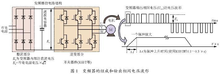 變頻器主要由把交流市電整流成直流的整流器、平滑電壓脈動的電容器、6 個開關器件構成的逆變器所組成。如圖1 所示,逆變器部分輸出由改變脈衝寬度(PWM 波)形成的等效正弦波交流電壓去驅動電機。近幾年的變頻器為了使電機低噪音化,逆變部分的開關器件采用IGBT進行著高速開關動作。因此,在PWM 波的每個脈衝上升和下降時,即開關時間以非常短的時間駐t=0.1~0.3 滋s切換著的時候,使逆變器內部的直流電壓Ed(400 V電力係統用逆變器的Ed=600 V左右)因切換所形成的電壓變化率dv/dt變得很大,這是產生微浪湧的主要根源之一。