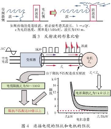 當電機阻抗很大時,反射波與入射波正向疊加,即ZL<ZM時,反射係數=1。而且,生成與逆變器的輸出脈衝同一極性、幾乎同一大小的反射波,疊加後成為微浪湧尖峰電壓。圖3 形象地表示了反射的情況,微浪湧電壓就像海浪遇到障礙一樣被抬得很高。圖4 表示實際電纜和電機的阻抗差別,一般電機的阻抗是電纜特性阻抗的10 倍以上,所以反射總是存在。