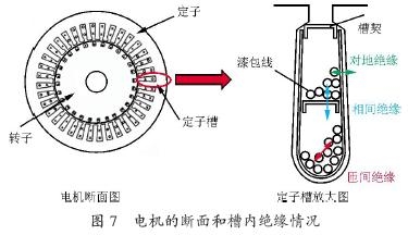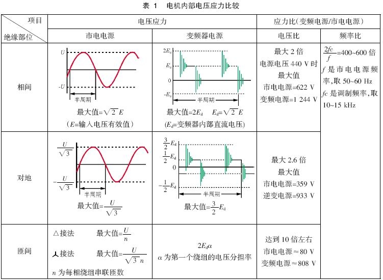 電機內部的斷麵如圖7 所示。電機有定子和轉子,定子內有安放三相線圈的槽。如果放大槽的內部,可以看到有許多的線圈(漆包線),各線圈對地之間、各相之間、線匝相互之間都有絕緣存在。通常對地、相xiang間jian都dou有you絕jue緣yuan紙zhi插cha入ru,而er線xian匝za之zhi間jian沒mei有you絕jue緣yuan紙zhi插cha入ru,它ta利li用yong堅jian固gu的de漆qi包bao線xian的de漆qi層ceng獲huo得de絕jue緣yuan。微wei浪lang湧yong電dian壓ya給gei這zhe些xie絕jue緣yuan全quan部bu帶dai來lai影ying響xiang,這zhe些xie絕jue緣yuan損sun壞huai之zhi中zhong,線xian圈quan匝za間jian損sun壞huai最zui多duo。表biao1 列出了有關電機內部各絕緣部分承受的電壓值,也稱為電壓應力,提供了用市電電源驅動電機和用變頻器驅動時相比較的資料。