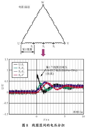 浪湧電壓滲入電機內部的時候,線圈匝間究竟加上多少電壓,模擬結果如圖8所示。該模擬是將測量點放在電機的每一線圈上(電機槽內的漆包線圈上),在U-V之間加上上升時間0.14 滋s 的浪湧電壓的測量的結果。U-S1之間是第1 線圈分擔的電壓,測得它分擔了全電壓65豫耀75%,而別的線圈S1-S2、S2-S3、S3-V 之間分擔了10豫耀20%,這是因為電機內部的阻抗大,微浪湧電壓在逐漸衰減。