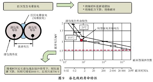 在zai電dian機ji的de製zhi造zao過guo程cheng中zhong,漆qi包bao線xian線xian圈quan的de起qi頭tou到dao末mo尾wei完wan全quan分fen離li不bu易yi做zuo到dao,多duo數shu情qing況kuang下xia是shi亂luan繞rao的de,槽cao裏li邊bian線xian頭tou和he線xian尾wei可ke能neng緊jin挨ai著zhe。如ru果guo這zhe樣yang就jiu會hui發fa生sheng線xian匝za之zhi間jian由you於yu微wei浪lang湧yong電dian壓ya的de電dian暈yun放fang電dian(局部放電)。那怕放電部分時間極其短促,局部也會達到10 000益,高溫使絕緣逐漸地侵蝕,過些時間之後絕緣就會被破壞。如圖9 所示為直徑0.85 mm、漆皮厚33 滋m、F 級絕緣、155益漆包線的壽命特性。