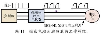 輸出濾波器的工作原理如圖11所示。微浪湧電壓是變頻器輸出脈衝上升時間出現的dv/dt 過大所引起,又由於阻抗不匹配被反射而發生。因此輸出電路使用濾波器,用於抑製dv/dt,也就是抑製了高頻成分因阻抗不匹配而造成的微浪湧。所以輸出濾波器是dv/dt抑製型濾器,這種濾波器在變頻器的調製頻率為15 kHz、接線長度為400 m時,能做出微浪湧電壓1 000 V以下的性能非常優良的產品。不過,這種方式的濾波器為了讓逆變器的輸出電流通過電抗器,不得不做成大容量,造成濾波器的大型化、高價格化、大重量,有的達到50 kg以上,給用戶造成了實際負擔。