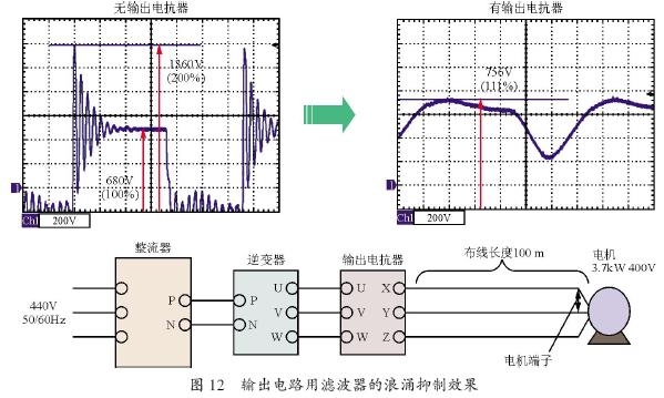 圖12 顯示了供電電源440 V,功率為3.7 kW的變頻器供電給電機(3.7 kW,400 V),在接線長度為100 m時、測量電機接線端子U-V 之間的微浪湧電壓的抑製效果。在沒有輸出濾波器的情況下,微浪湧電壓達到1 360 V,相當於變頻器內部直流電壓680V 的200%。有輸出濾波器的時候,頂峰值電壓是756 V、相當於變頻器器內部的直流電壓680 V的111%,它和沒有輸出濾波器的頂峰電壓差距有604 V,抑製效果達89%。