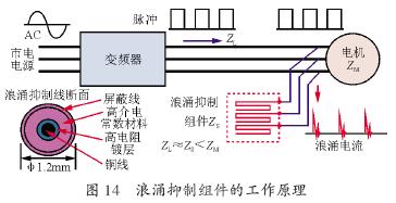 浪湧吸收:浪湧是高頻波成分,低阻抗的浪湧抑製線接在電機接線端子上,讓浪湧電流流到抑製線裏麵去,如圖16所示。