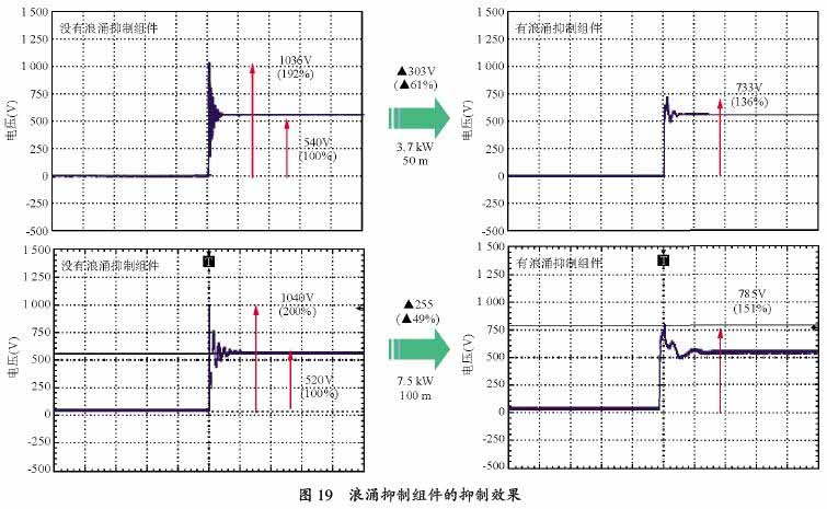 圖19 是變頻器的電源電壓為400 V,3.7 kW的電機、接線長度50 m,和75 kW的電機、接線長度100 m時抑製微浪湧電壓的效果。對於3.7 kW的電機,當沒有浪湧抑製組件時,微浪湧電壓為1 036 V,相當於變頻器內部的直流電壓540 V的192%;當加了浪湧抑製組件時,50 m電纜的峰值電壓為733 V,相當於變頻器內部的直流電壓540 V的136%。電壓尖峰差距303 V,有61%的抑製效果。對於75 kW的電機,當沒有浪湧抑製組件時,微浪湧電壓為1 040 V,相當於變頻器內部直流電壓520 V的200%;當加了浪湧抑製組件時,電纜的峰值電壓為785 V,相當於變頻器內部直流電壓520 V得151%。電壓尖峰差距255 V,有49%的抑製效果。