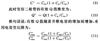 此時,調諧電容的有效Q值增加到(Q是變容管的品質因素)