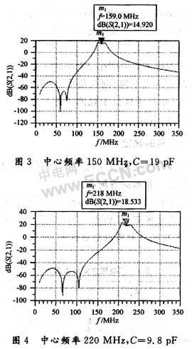 tongchang,diantiaoxielvbocaiyongshuangjidiantiaoxielvbo,xiezhenhuilufenweichuanlianxiezhenhuiluhebinglianxiezhenhuilu,tongguodianganhuodianrongjinxingouhe。cidiantiaolvboqicaiyongdeshibinglianxiezhenhuilu,yongdianganjinxingouhe。zaijinxingfangzhenzhiqian,xuyaojianlifangzhenmoxingheshejigezhongcanshu。jiyuyishangmoxing,liyongADS軟件對電調濾波器進行電路設計和仿真。由於係統要求對該電調濾波器進行AGC控製,所以在仿真時加入雙柵FET。傳輸函數S21、頻率範圍設在10~350 MHz、電容在2.6~39 pF之間變化,仿真使用的放大器是NE25118。最終的ADS模型仿真結果如下麵兩組曲線所示。若LC濾波器不使用放大器,仿真結果中可以看出濾波器的插損在2~3 dB左右。