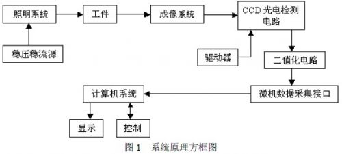整個檢測係統由照明係統、被測工件係統、成像物鏡、CCD 光電檢測係統和計算機測控係統(8031 單片機和8279 鍵盤/顯示芯片等)構成。穩壓穩流調光電源為遠心照明係統提供穩定的照明光,被照明的工件經成像物鏡成像在線陣CCD 的光敏陣列麵上。由於工件不透光,工件的像在中間部分形成暗帶,兩側形成亮帶。 暗帶的寬度就是工件尺寸所成像的大小。線陣CCD 在驅動脈衝的作用下完成光電轉換並產生視頻信號。其係 統原理圖如圖1。