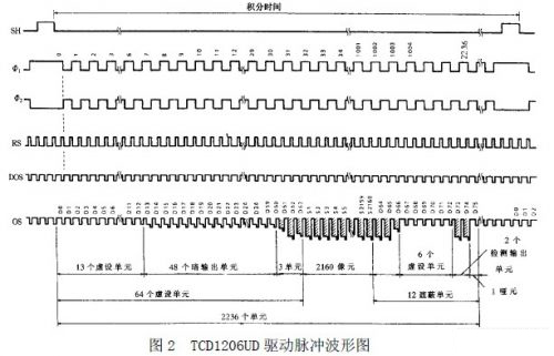 在1MHz 數據率情況下工作時,有效像元輸出時間為2.16ms,鋼絲繩直徑信號產生於2.16ms 期間。輸出信號的暗電平可控製在1.0V 左右。而高電平可接近10V,相差比較大。當光學係統調整得比較好時,圖像邊緣的信號比較陡,測量誤差較小。TCD1206UD 的工作原理和驅動電路如下: