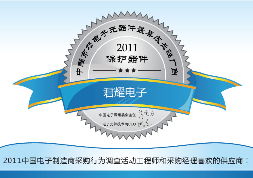 在近日剛剛結束的2011中國電子製造商采購行為調查暨中國市場電子元器件領軍廠商的評選活動中,君耀電子憑借本地化和快速的服務、可靠穩定的產品質量和技術指標等多方麵優勢,以及在工程師心目中形成的良好形象,一舉榮獲2011中國市場電子元器件保護器件類最具成長性廠商稱號!