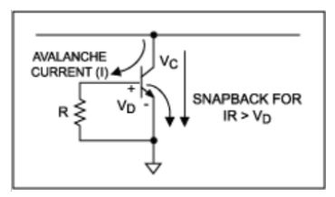 雙極型IC的箝位電路類似於在受保護核電路中提供一個受衝擊時擊穿的部件,圖3給出了圖1中箝位功能的詳細電路。箝位晶體管的過壓導致集電極-基極之間的雪崩電流,發射結的正向偏置會進一步提高集電極電流,導致一個“突變”過程。箝位時的V-I特性曲線如圖4所示。