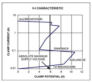 [page]箝位電壓從第一次擊穿變化到突變穩定後的導通電壓,如圖5所示。為保證箝位時關閉正常的工作條件,設計的箝位電壓一般要略高於IC的絕對最大電壓。