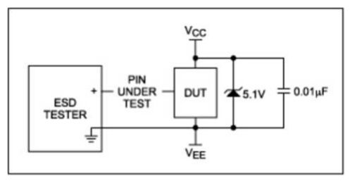 箝位電壓高於IC所能承受的電壓(典型值6V),低於二極管的擊穿電壓(約10V)時,對於存在去耦電容的情況,因為電容儲能可能導致某些問題。如果IC 在沒有外部電路的情況下進行測試,引腳上作用10V電壓是可以接受的,對器件不會構成威脅。