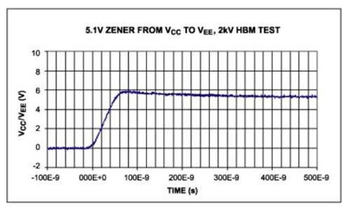 箝位二極管在IC其它電路遭到破壞之前導通,箝位管要有足夠的承受力,保證ESD電流不會導致二次擊穿。2kV HBM測試的箝位過程如圖5所示,圖5中的電壓包括I-R壓降和突變穩定後的箝位電壓。