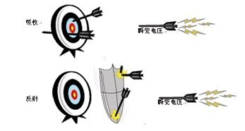 簡而言之,SPD 會阻止具有破壞性的瞬變電壓浪湧電平到達所保護的設備。SPD 通過吸收過剩的電壓、將其分流或者組合使用這兩種手段,達到削弱浪湧電壓的目的。圖 1顯示了飛向靶子的箭。靶子代表 SPD,而(er)箭(jian)代(dai)表(biao)瞬(shun)變(bian)電(dian)壓(ya)尖(jian)峰(feng)脈(mai)衝(chong)。當(dang)箭(jian)擊(ji)中(zhong)靶(ba)子(zi)時(shi),它(ta)會(hui)被(bei)吸(xi)收(shou)並(bing)滯(zhi)留(liu)在(zai)靶(ba)子(zi)中(zhong)。然(ran)而(er),靶(ba)子(zi)的(de)厚(hou)度(du)將(jiang)決(jue)定(ding)箭(jian)是(shi)否(fou)可(ke)以(yi)在(zai)沒(mei)有(you)穿(chuan)到(dao)另(ling)一(yi)側(ce)時(shi)停(ting)止(zhi)。同(tong)樣(yang),在(zai)這(zhe)種(zhong)模(mo)式(shi)下(xia),箭(jian)將(jiang)不(bu)停(ting)地(di)損(sun)壞(huai)靶(ba)子(zi),將(jiang)來(lai)靶(ba)子(zi)可(ke)能(neng)無(wu)法(fa)很(hen)好(hao)地(di)阻(zu)止(zhi)箭(jian)。現(xian)在(zai),假(jia)設(she)在(zai)靶(ba)子(zi)前(qian)麵(mian)有(you)一(yi)個(ge)金(jin)屬(shu)盾(dun)牌(pai)。箭(jian)發(fa)出(chu)後(hou),它(ta)會(hui)擊(ji)中(zhong)盾(dun)牌(pai),無(wu)任(ren)何(he)損(sun)害(hai)地(di)彈(dan)飛(fei)到(dao)靶(ba)子(zi)的(de)旁(pang)邊(bian)。這(zhe)就(jiu)是(shi)大(da)多(duo)數(shu) SPD 的基本工作原理。SPD 吸收能量(並且根據它們的質地好壞,可以防止浪湧,但仍然會受到損壞),或者將電壓分流到設備接地線中。在大多數情況下,SPD 會將吸收和分流瞬變電壓浪湧的設備組合使用。