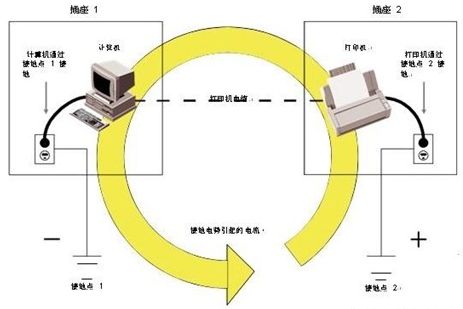 gongchangsheshizhongdejiedilianjiezhinenglianjiedaodianlixianlupeidianbanshangdedanyilianjiedian。zhezhongyudimiandandianlianjiedefangshikeyibimianyouyushuhuerzaochengduogejiedidian。duogejiedidianhuizaochengshidiandianyadechayi,daozhibuxiwangdedianliuliuxiangdiyashujuxian。bingduishujuchuanshuzaochengzaoyinganrao,suiranbuhuiyinqitaidadesunhai,danyekenenghuixingchengshunbiandianyalangyong,yanzhongsunhuaishebeichuanshuxian。tu 2 顯示了一個接地回路示例。每個設備獨立接地(每個電源插座都參照不同的接地點)。如果設備通過某種形式的接地(也導電)數據線連接在一起,就會出現問題。在圖2 中,計算機使用並行通信電纜連接到打印機。如果所使用設備接地點之間存在電勢差(有電荷差異),那麼電流可能會通過並行電纜從一個設備流到另一設備,以便中和電荷。這就是“接地回路”,會對設備造成嚴重損壞,因為設備在正常條件下隻需很小的電力就 可以工作。雖然這個示例隻顯示了一處設施,但接地回路也可以在不同設施之間形成。