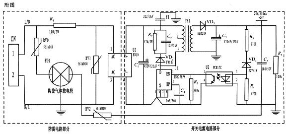 陶瓷氣體放電管的通流容量根據要求的通流容量選擇,電路采用3RM470L-7.5-L,通流量為5000A。線繞電阻R1起限流分壓作用;貼片整流模塊為開關電源電路前端整流作用,C1為高壓濾波電容,Y1為去耦電容,電阻R2和電容C2及VD2組成開關電源芯片MOS管的吸收鉗位電路,保護芯片,開關電源芯片采用PI公司的TNY27係列,TR1為高頻變壓器,VD3、C3構成高頻變壓器次級濾波,U2、VD4、R3、R4、R5構成開關電源電路的反饋電路,可將變壓器次級輸出電壓穩定在設計值,此防雷抗浪湧電路在實際使用中取得了較好的效果。