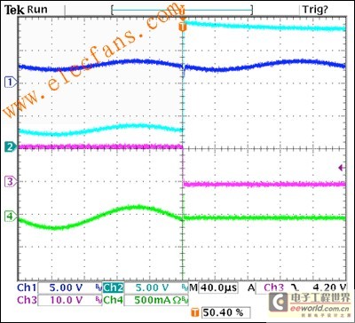 圖2的波形代表一個工作電路。放大器的輸出之一(上跟蹤,深藍色)是一個1kHz正弦波直流偏壓為2.5V。第二次跟蹤(青色)是線束上看到的信號。這也從一開始就是在2.5V直流偏置一個1kHz正弦波,但200μs是一個18V電源短路。第三次跟蹤(洋紅色)是分流穩壓器輸出,最初在11V的偏見,但拉回應過壓條件地麵。第四次跟蹤(綠色)線束的電流。最初是一個正弦波,電流下降到零這個回應過壓條件。