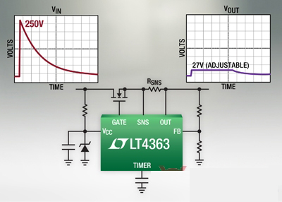 LT4363 控製器是以淩力爾特廣受歡迎的第一代器件 LT4356 為基礎而開發,並在未犧牲過流保護性能的情況下將過壓保護能力擴展至 100V 以上。LT4363 可對負載端的過流和短路故障作出快速響應,從而能將電流限製在檢測電阻器設定的安全值上。