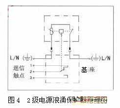單片(單極)設計、用於防止電源係統因雷擊過壓或操作過電壓對設備造成損壞。適用於低配電係統的第二級保護。依據不同的配電係統(T T/T N/I T)的選擇多種組合方式。圖4所示為2級電源浪湧保護器原理圖。