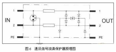BAx係xi列lie信xin號hao浪lang湧yong保bao護hu器qi是shi專zhuan為wei通tong過guo雙shuang絞jiao線xian進jin行xing信xin號hao傳chuan輸shu的de設she備bei而er設she計ji,以yi保bao護hu其qi避bi免mian遭zao受shou感gan應ying過guo電dian壓ya和he操cao作zuo過guo電dian壓ya的de損sun害hai。該gai浪lang湧yong保bao護hu器qi輸shu入ru、輸出采用RJ45公/母於接頭串聯保護。網絡信號浪湧保護器原理圖見圖5所示。