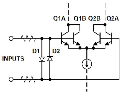 某些運算放大器的輸入還具有背靠背二極管,這不是用於輸入過壓保護,而是限製差分電壓。如果存在這種二極管,差分輸入電壓將有±700 mV的絕對最大額定值。